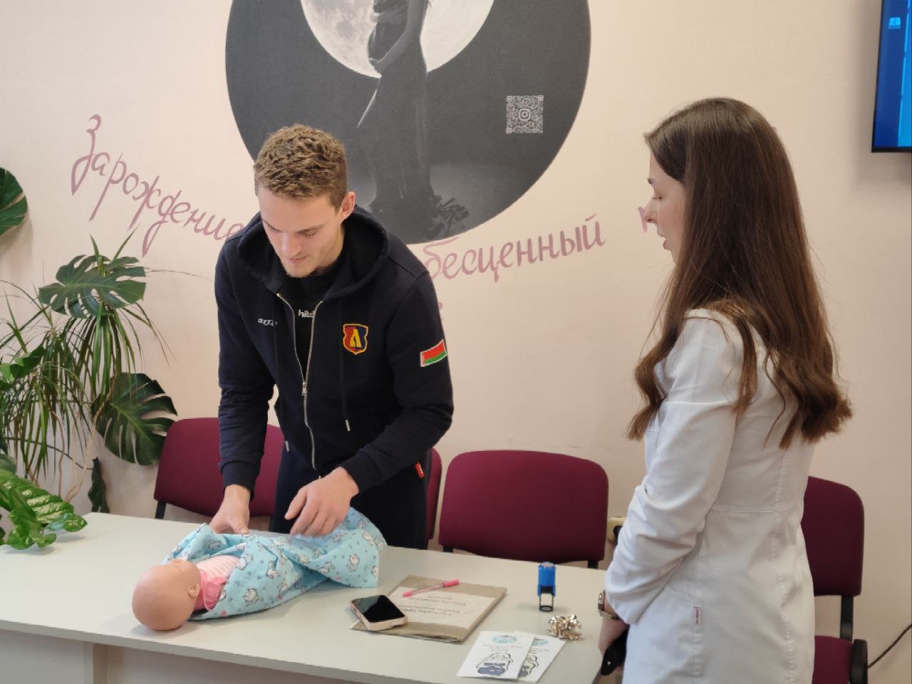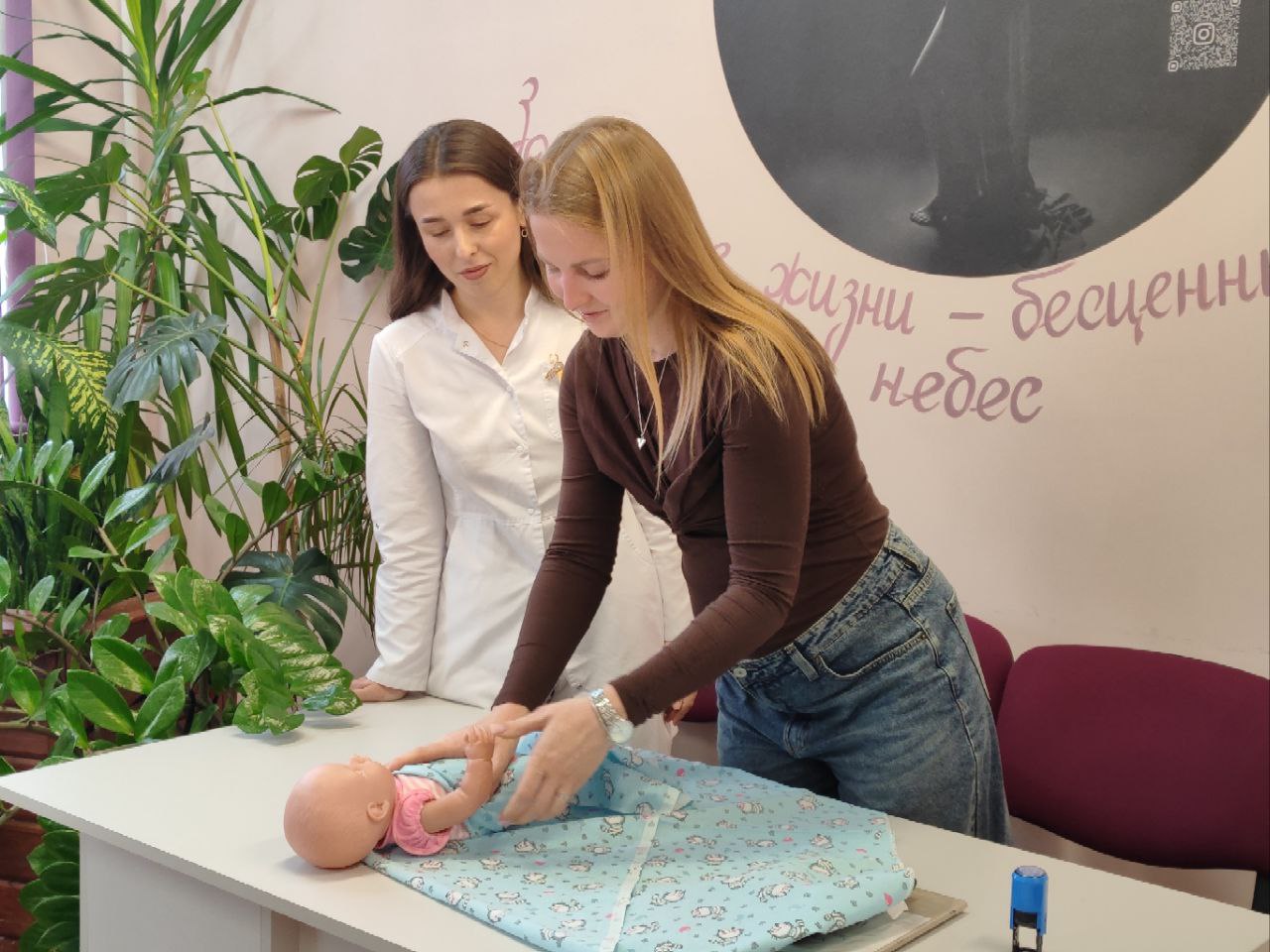 На этом занятии мы говорили о тонкостях ежедневного ухода и о свободном пеленании. Провела занятие врач-акушер-гинеколог Сильванович О. А.