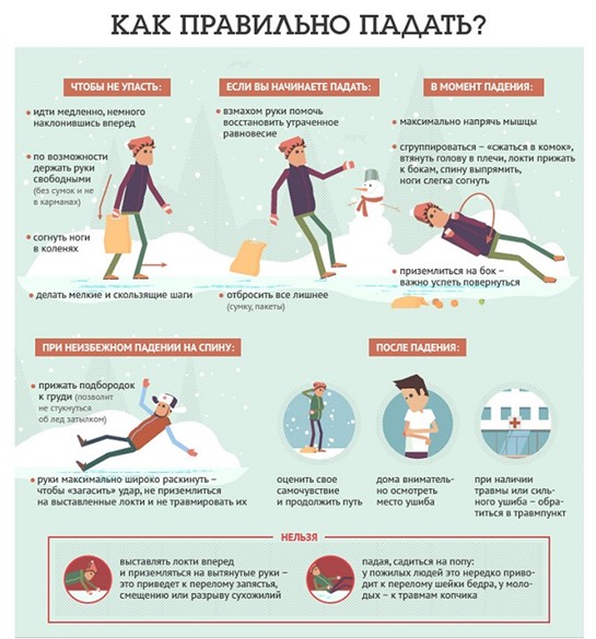 9. Если вы упали, осмотрите себя, проверьте, нет ли травм, попросите прохожих людей помочь. Помните: особенно опасны падения на спину, вверх лицом, так как можно получить сотрясение мозга. При получении травмы обязательно обратитесь к врачу за оказанием медицинской помощи.